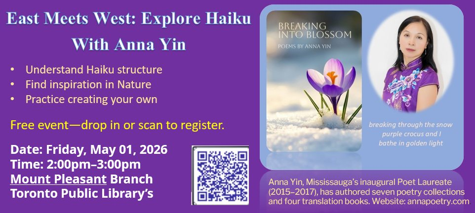 May is approaching—it’s time to celebrate Asian Heritage Month. How about joining this free event: East Meets West: Explore Haiku with Anna Yin?
